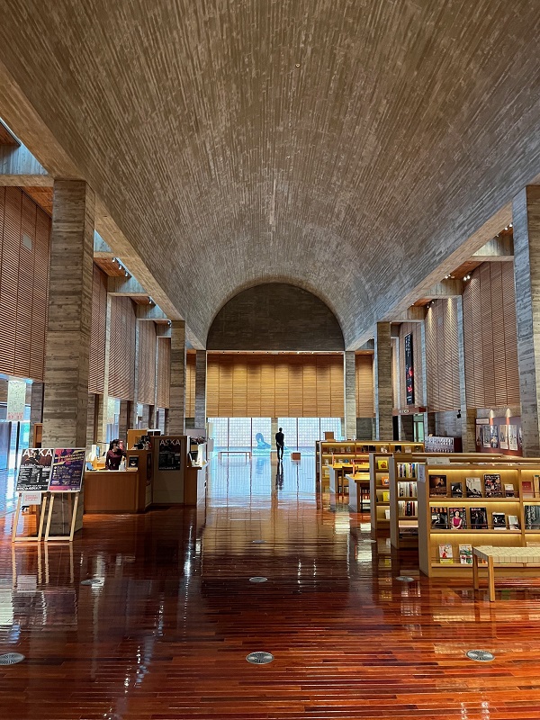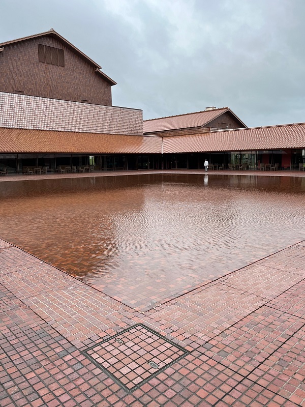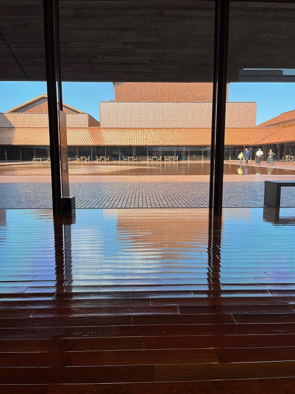 水盤のある中庭が中心にあり、それに面して回廊が美術館と音楽ホールを繋いでいる複合施設です。この中庭は本当に素晴らしかった。床はタイル、屋根と外壁は石州瓦、外壁は2種類の石州瓦で仕上げられているのですが、同じ1つの素材で中庭を囲んでいるように感じます。要素を抑えることで心地よい緊張感と静けさが支配している空間でした。回廊にいると聞こえない雨や風の音、鳥の鳴き声、水盤の水が流れ落ちる音が中庭に入ったとたん鮮明に聞こえてくるのが驚きでした。中庭から見える建物の見せ方も良かったです。ヴォリュ-ムをいくつかに分けて色々な形をした姿は集落の一つのようです。4面それぞれ違う景色を見ることができます。あと気になったのはコーナ-の納まり、コーナ-を直角にならないようにしているようです。中庭のコーナ-のガラス面は少しだけ45°で斜めに、外壁の石州瓦のコーナ-は角を出さずに役物でへこませています。(写真4)内部壁のタイル貼りも同様でアングルで見切りを付けています。そして四角い水盤のコーナ-も。水深は中央で12mm、端部で5mm、中央から端部へと流れます。水盤の外周部に15mmほどの目地がありそこに水が流れる仕組みです。(これもすごい!)(写真5)水盤のコーナ-は水が届いていない所があって、それにより水のコーナ-が消え水の動きが自然な感じに見えたのです。これは偶然なのか意図的なのか、はたまた思い込みなのかちょっとわからないですが、角を消すと柔らかさや、流れ、馴染み、などが感じられると思います。中庭のことばかりでしたが美術館のホールも良かったです。(写真6)