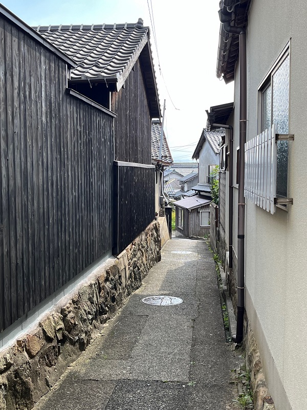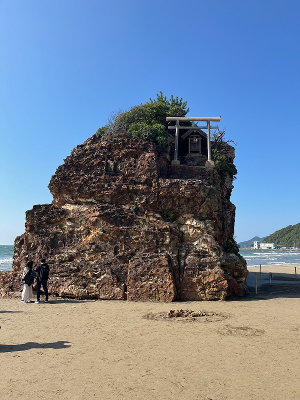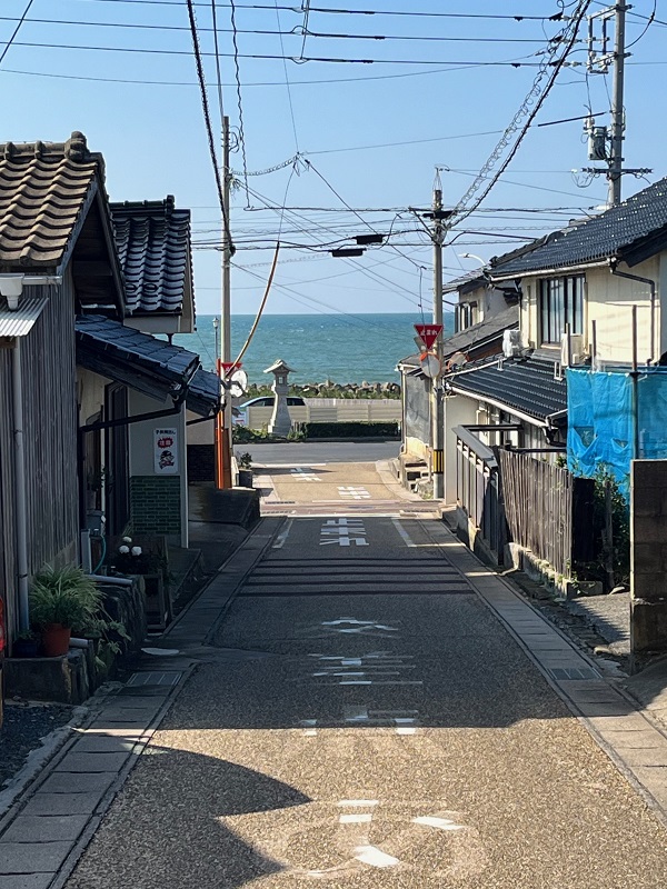 出雲大社 僕が島根に行った時期は神在月でした。旧暦の10月は一般的には神無月と呼ばれていますが、この地方では全国の神様が出雲に集うので神在月と呼ばれています。集まった神々は稲佐の浜で迎えられ出雲大社に向かいます。神々が通る「神仰の道」というのがあるので僕も稲佐の浜から歩いてみました。稲佐の浜には砂浜に大きな岩が1つだけあって、そこに鳥居と祠が置かれています。なぜ砂浜にこんな大きな岩があるのか不思議ですが、迎える場所としてここを選択したことは至極当然な事に思えるほど、存在感と神々しさを感じます。(写真2)稲佐の浜をあとにし出雲大社まではゆるやかな坂道を登ります。振り返ると海が見えました。(写真3)このあたりの屋根瓦は石見で見た赤はなくなり黒い瓦が多く、しっとりとした雰囲気。(写真4)古い家の軒先で見かけた花を飾った竹筒は「潮汲み」で使うもので、毎月1日の朝、稲佐の浜で竹筒に潮を汲んで出雲大社に行く習わしだそうです。それを通リを行く人々へのおもてなしとして竹筒に草花を飾っています。飾られたツワブキの花はとてもきれいでした。(写真5)そして出雲大社に着くと境内にはそのツワブキの花がたくさん咲いていました。なんかこういう、おもてなしは控えめだけど品があってすごく素敵だなあと感動しました。