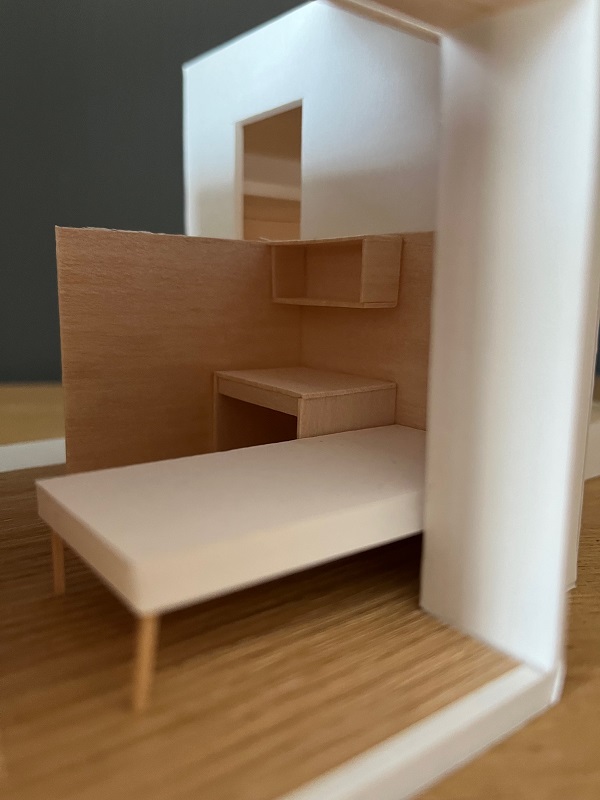 奥に夫婦の寝室を設け、手前の広いスペ-スを子供部屋に配置。手前のスペ-スは奥の部屋への動線と収納スペ-スがあるので、壁で完全に仕切ってしまうと窮屈さを感じてしまいます。そこで完全に仕切らずゆるやかにすることで、全体の気積を感じ広さと明るさを確保できるようにしています。